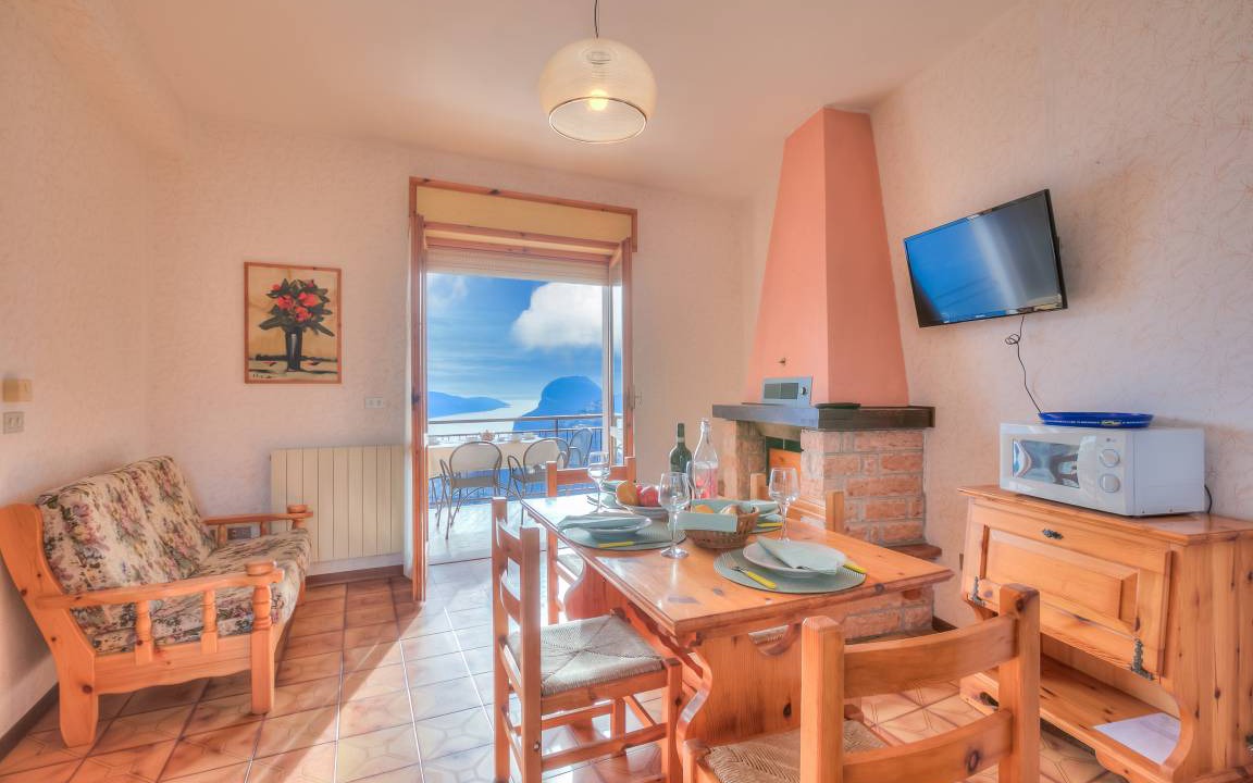 The lake-view living room of the apartment has an open layout. It has a sitting area, a dining table and a kitchen that is equipped with an induction hob, a microwave, a drip coffee machine, a toaster, an electric kettle and a fridge.