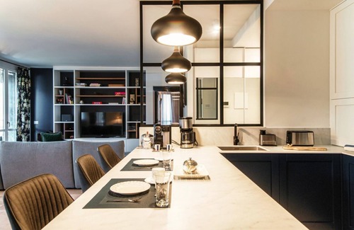 The apartment can accommodate up to four people with its two double bedrooms. You will find a spacious kitchen equipped with everything you need - induction cooktop, kettle, fridge, dishwasher, oven, microwave, etc and furnished with stools and a counter for maximum functionality. There are two modern bathrooms with showers and a comfortable living room with a cosy sofa and a flat-screen TV. Additionally, the apartment is equipped with a washing machine, which you will find in the laundry room, and free wi-fi.