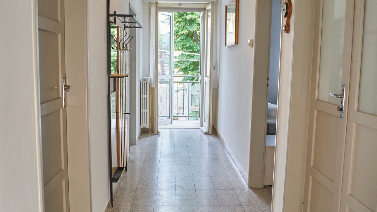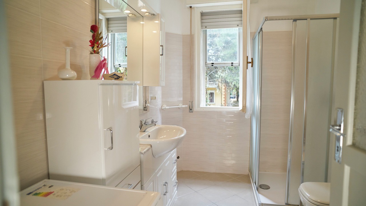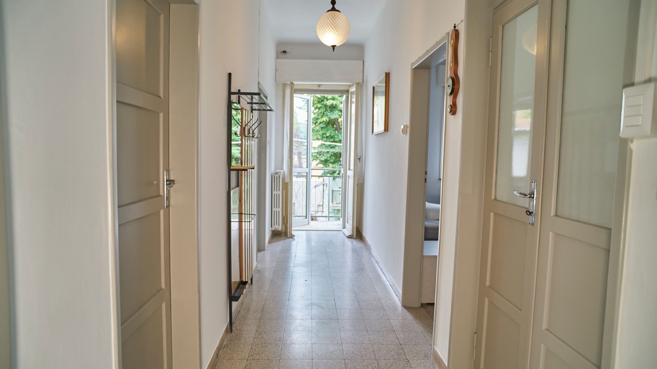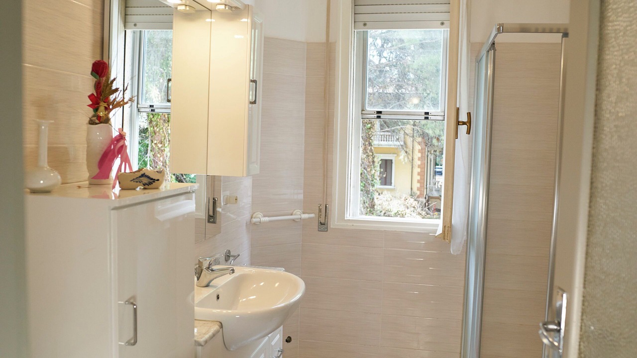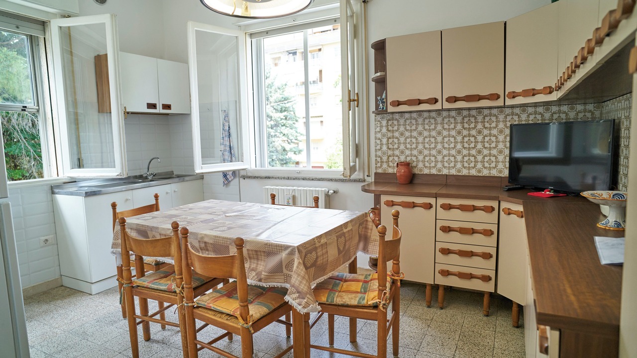 Large apartment on the first floor of a two-family building, 300m from the sea in Viale Cormons, on the Marina Centro beach between Piazzale Kennedy and Grand Hotel, in a residential area with all neighborhood services and 5 minutes walk from the central station for quick travel without the need for a car. The apartment consists of: entrance hall, kitchen, sleeping area consisting of 3 bedrooms (two double bedrooms, one with a French bed), bathroom.