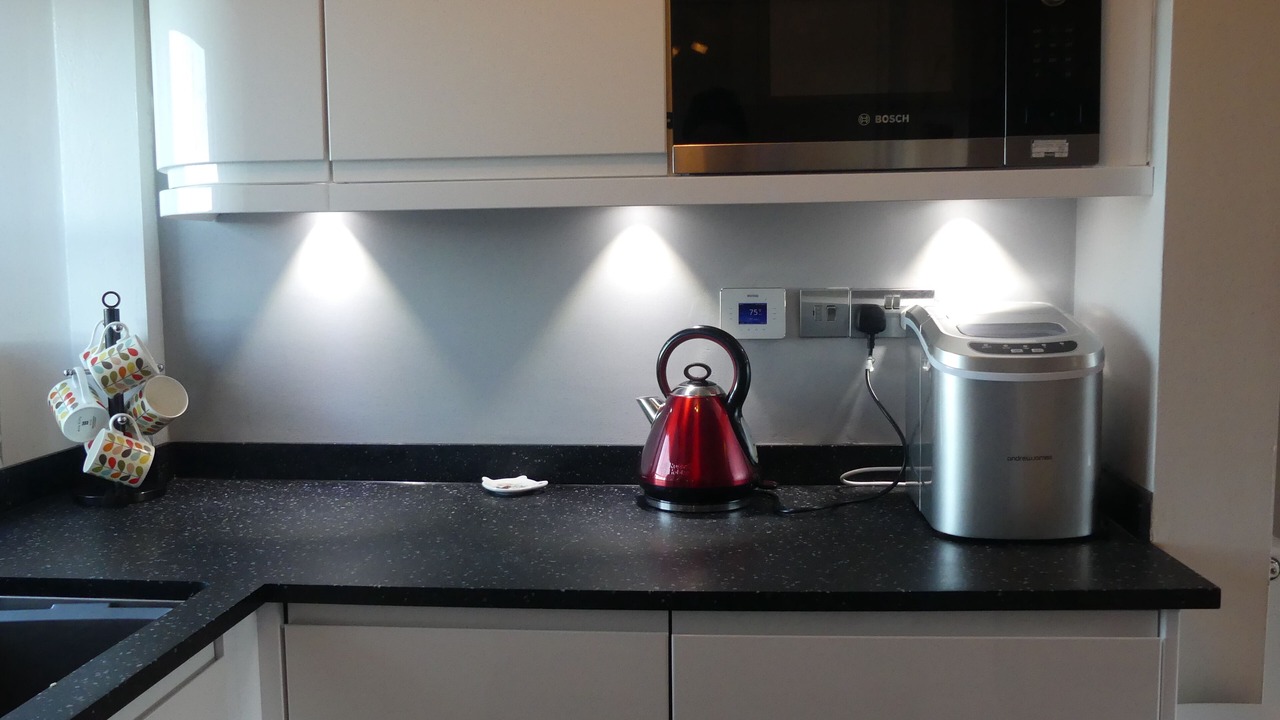 The kitchen has a fridge, a dishwasher, washing machine / dryer, a hob, an oven, a kettle, an ice-maker and a microwave.