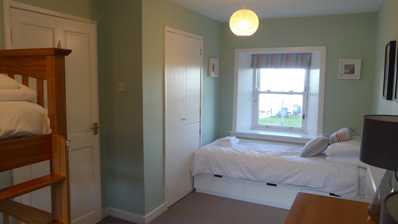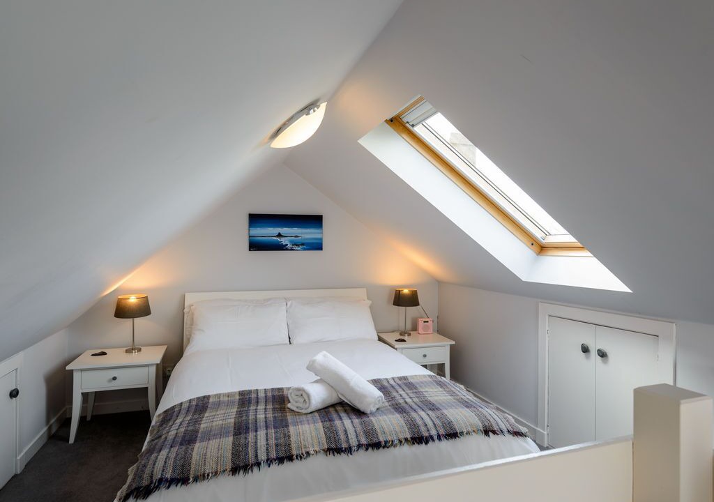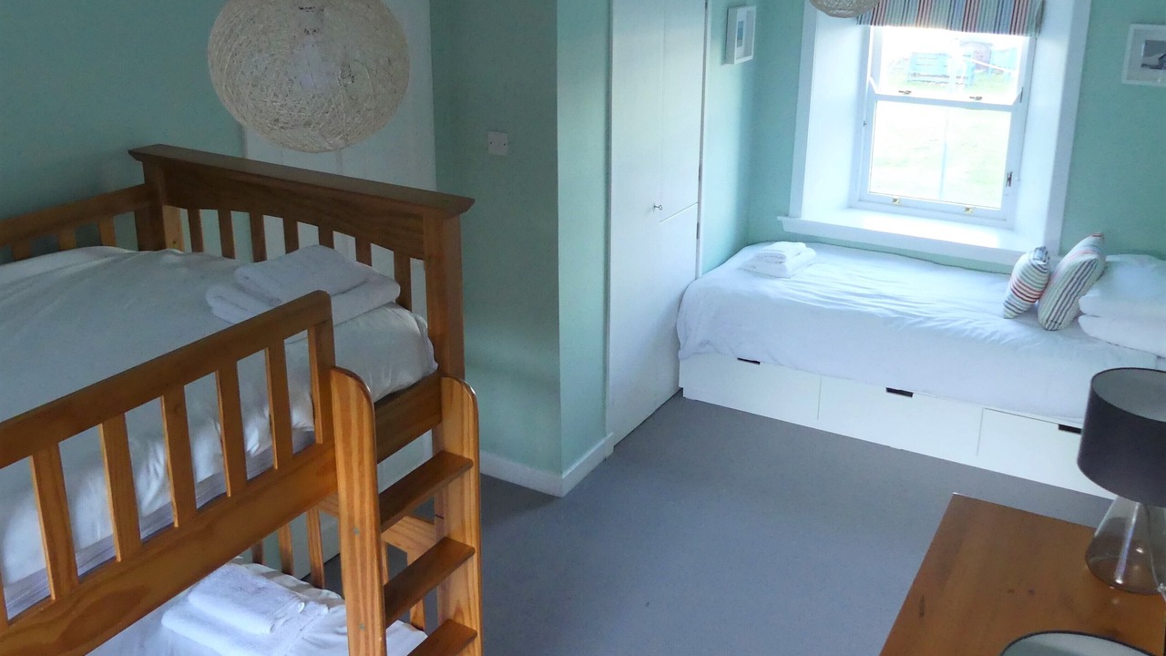 This cottage has 2 bedrooms and can comfortably sleep 5. The narrow staircase leads you to the first bedroom, you will find a queen sized double bed (note, restricted head height in parts). The large second bedroom contains a bunk bed and a single bed (all full size).