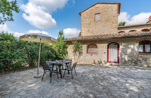Ancient country house in the hills of Chianti, surrounded by oak woods, vineyards and olive groves, carefully renovated and transformed into 6 vacation apartments. The architectural features that made this part of Tuscany world famous have been preserved and highlighted so that the stone walls, windows and the arches of the loggias resemble natural frescoes. Beautiful view of the countryside. Quiet position. The property, fully fenced and embellished with flowering plants, has a beautiful lawn with garden equipment and a swimming pool. Comfortable furnishings with rustic furniture. Tips for day trips: San Donato in Poggio (stores of all kinds) 1.5 km, San Gimignano 18 km, Florence 20 km, Siena 32 km. Fly screens in every room.