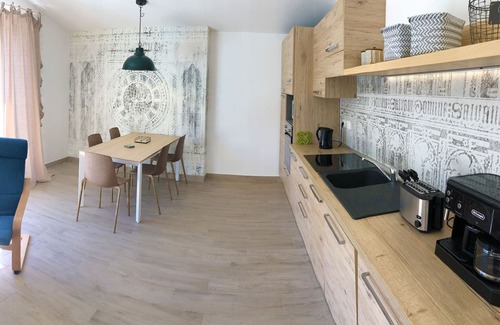 This apartment is one of 4 apartments that we build on the first floor above our restaurant. The apartment is 80 square meters and can comfortably accommodate 5 people. It has a large terrace of 20 square meters equipped with table, chairs, deck chairs and a large parasol; from here you can enjoy a wonderful panoramic view of the lake. The kitchen is equipped with a fridge, dishwasher, induction cooker, oven, microwave, electric coffee maker, kettle and toaster. There is a double bedroom and a bedroom with three single beds. The apartment also has a washing machine, television and Wi-Fi.