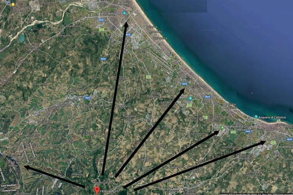 Pretty house with rock garden located in the Municipality of Montescudo-Montecolombo, in the Province of Rimini, Italy, in a central position about 25 km from Rimini and its sea and airport, 20 km from Riccione and from the A14 motorway entrance, from the Autodrome Marco Simoncelli from Misano and from the center of San Marino. It is also located near the center of Montescudo and 500 meters from the hamlet of Santa Maria del Piano renowned for the production of crockery, vases, jugs, jars. During the summer, an umbrella and two beds are included in the price of the stay in the Acquamarina bathhouse in Rimini, 25 km from the property.