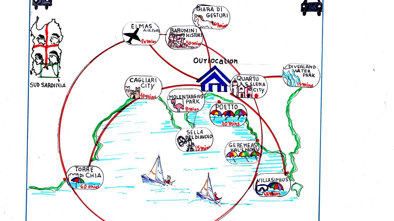 In a few minutes about 5/10 you reach the Poetto beach by bike or by car, the first beautiful beach over 8 km long that goes from the Sella del Diavolo in Cagliari and arrives at Quartu S. Elena, where you can find different beaches Bathing to stay comfortably on the beach with your family. From Quartu S. Elena continuing along the coast and for over 50Km there are the most beautiful beaches of southern Sardinia.