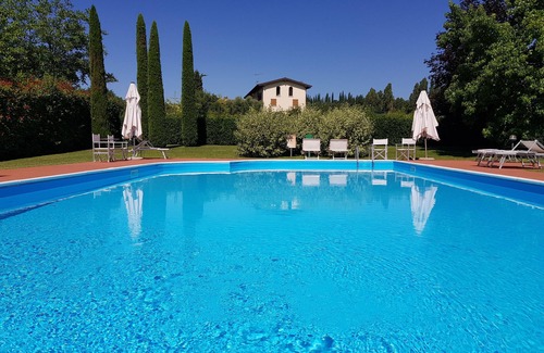Surrounded by greenery and tranquility, the house is adjacent to the prestigious Garda Golf Country Club and a 5-minute drive from the beaches of Moniga and Manerba del Garda.