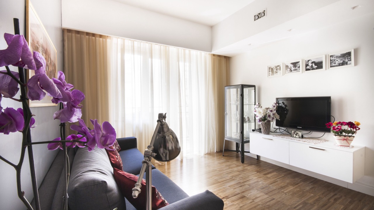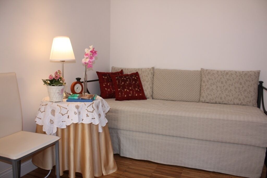 HOW MANY PEOPLE CAN THE APARTMENT ACCOMMODATE? The inside of the apartment can comfortably accommodate 5 adults. Bedroom: double bed (King-size) and single bed, a crib for a baby. Living room: double sofa bed (King-size). The sofa is very easy to open. All the beds are equally comfortable.