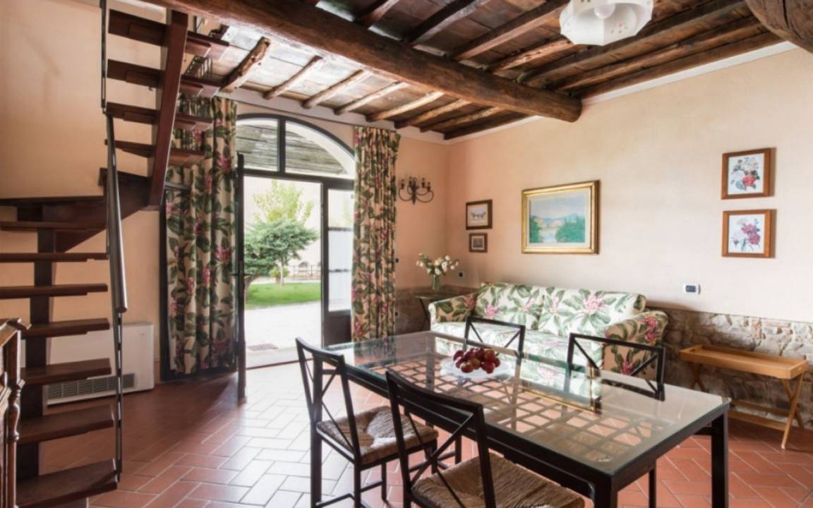 The Fienile apartment (about 55 sqm - 3 + 2 beds) is located at the back facing the swimming pool and has a private and equipped outdoor area. The apartment is on two levels and is equipped with kitchen, bathroom with shower and sofa bed downstairs. On the upper floor there is a bedroom with a double bed and a single bed and an additional bathroom.